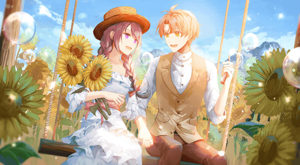 放眼所及是一片金黃色向日葵花海。我瞧著三月凝視花田的側臉,想知道他此刻究竟在想些什麼,卻無從獲得解答,落得一陣靜默。我悄悄牽上三月的手,只見他揚起嘴角。「怎麼了?怎麼一直看著我?」三月柔聲問道,臉越靠越近。「……沒事。」臉頰上升的熱度一定是烈日曝曬的緣故,我想,三月不愧是當紅偶像,笑容如此燦爛好看……我自他臉上別開視線,望著花田裡的花朵們。「向日葵真美。」三月的臉上依然掛著笑容,我嗯了聲,稍稍頷首表示回應。薰風輕拂,我抬頭凝視萬里晴空,正想著今天能來賞花真是太好了的時候,三月將我的手握得更緊了。「琴音也很美哦。」「……咦?」「比向日葵還美。」被三月調侃的我絕對是臉紅了,「沒頭沒尾的在說什麼……」「噓。」三月俏皮地眨眨眼,摘了一朵向日葵便交付於我。我垂眸欣賞著手中耀眼的金黃色花朵,見狀,三月輕聲笑了:「和琴音的笑容很相襯。」我無視了三月的揶揄,喊了他的名:「三月。」「嗯?」「我覺得,偶像彷彿就是太陽一般的存在。」而粉絲如我則是成群的向日葵,無論花開花落,終其一生都守望著燦爛的陽光。語畢,我在三月澄澈的橘黃眸子裡找到了自己的身影。「哎,但我不這麼認為。」「那……」「比起滿山遍野的向日葵,我覺得琴音更像是永生花,只為我綻放而永遠不凋零。」三月侃侃而談,「因為琴音一直在我身邊啊。我相信不只是現在,即使是遙遠的未來也會有妳作伴。」我開口逗他:「那如果我後悔了,不陪你了呢?」只見三月賊兮兮地笑著:「再想後悔也來不及了,畢竟我們都是夫妻了嘛。」我聳聳肩,「換作是幾年前,我絕對沒辦法想像自己真的能和偶像在一起。」「那麼,請認清現實的和泉夫人主動獻吻?」「不、要。」我吐舌。「哎呀,那沒辦法,只好由我親親可愛的妻子了?」在三月湊上來的那瞬間,我似乎有了直視著橘紅太陽的錯覺。在繁茂向日葵構築的兩人世界之下,我與我的太陽先生交換了無數個吻。